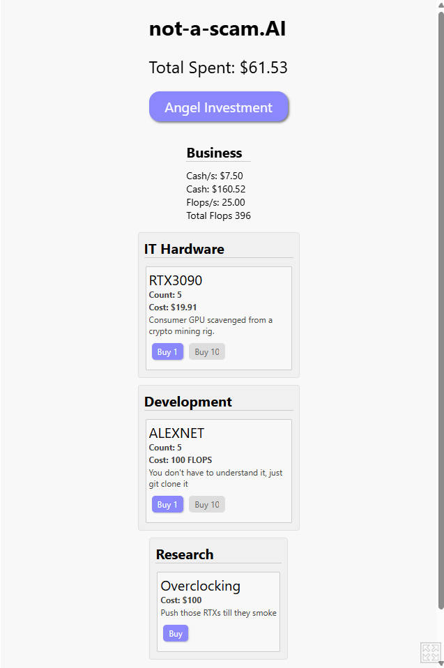 Alpha 1 - The initial game jam version. Has GPUs you buy to create compute, LLMs you buy to generate cash, and research that unlocks better GPUs and LLMs as well as reducing purchase prices and increasing income from stuff you own.